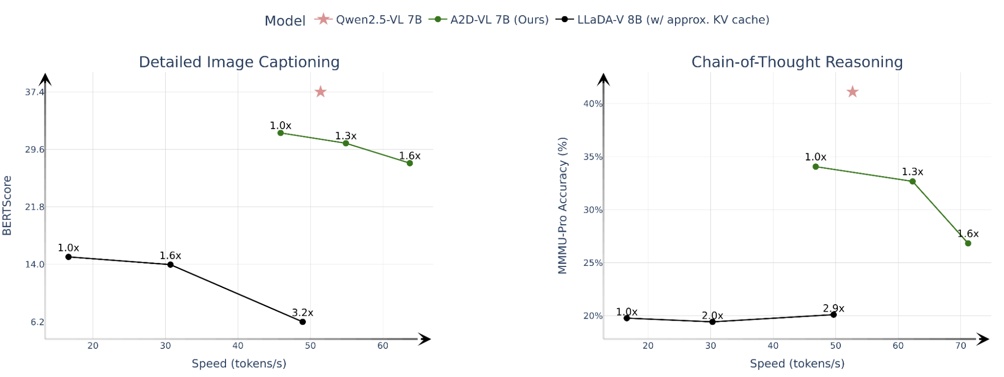 By adapting pretrained autoregressive VLMs for diffusion, A2D-VL strikes an improved balance between inference speed and downstream performance. We compare the speed-quality trade-off between A2D-VL 7B, Qwen2.5-VL 7B, and the diffusion VLM LLaDA-V 7B. For LLaDA-V, we follow the recommended settings: approximate KV caching with recomputation every 32 steps and "factor"-based confidence thresholding [1, 9].