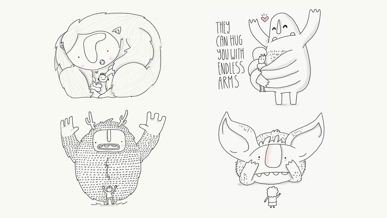 Taras would send Xevi sentences—thoughts about finding strength, about the calm you need when everything feels chaotic. Xevi would respond with monsters. Not scary ones. Gentle giants representing strength, rest, peace: the small dignities of survival.