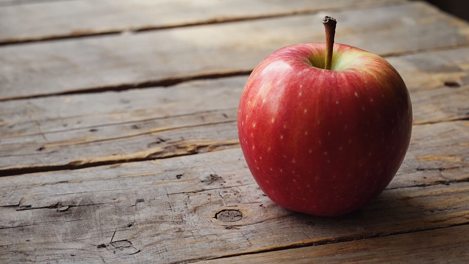 "A crisp red apple on a weathered wooden table, soft natural lighting from a window, shallow depth of field"