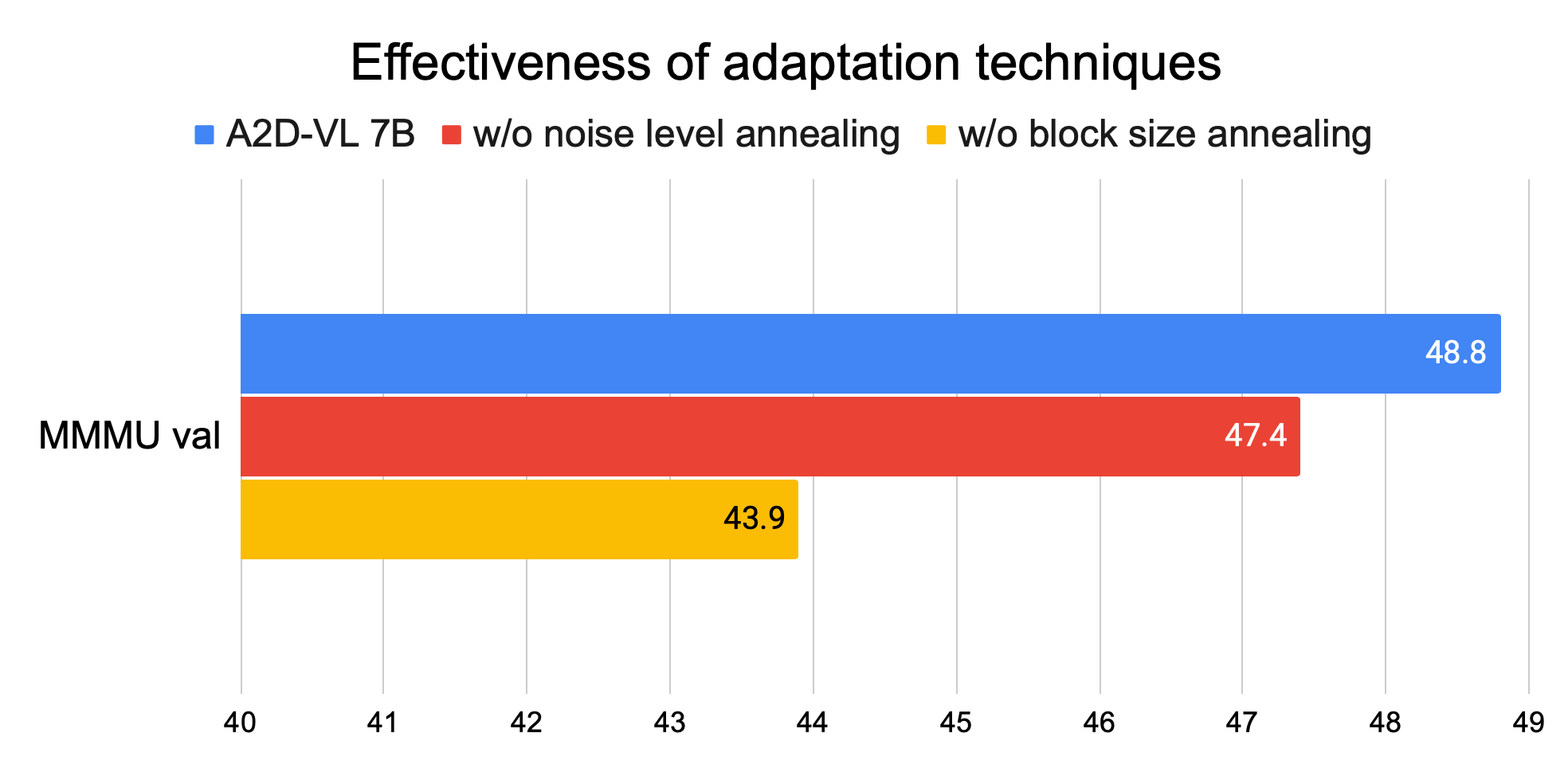 We ablate these strategies in Fig. 3, which shows the importance of both strategies for preserving benchmark performance of the base model. Concurrently, [14] also adapts Qwen2.5 for block diffusion decoding in NLP-only tasks. In contrast, we explore vision language models and propose novel adaptation techniques that are critical for retaining model capabilities.