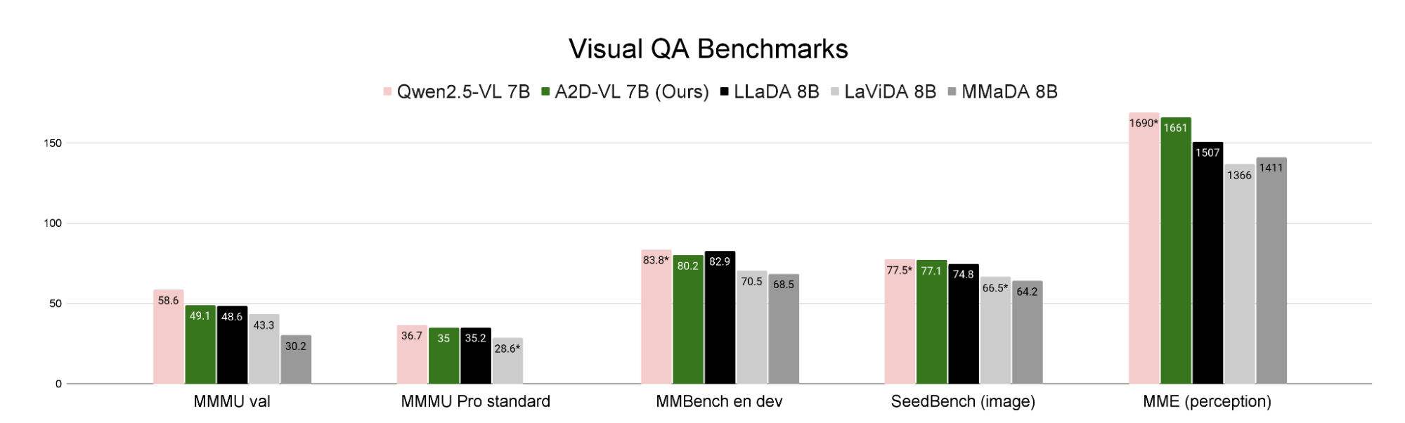 Efficient training. By adapting existing VLMs, our approach requires significantly less training than training diffusion VLMs from scratch. While LLaDA-V 8B [1] trains on ≥12M visual QA pairs, our A2D-VL 7B is trained on 400K pairs.